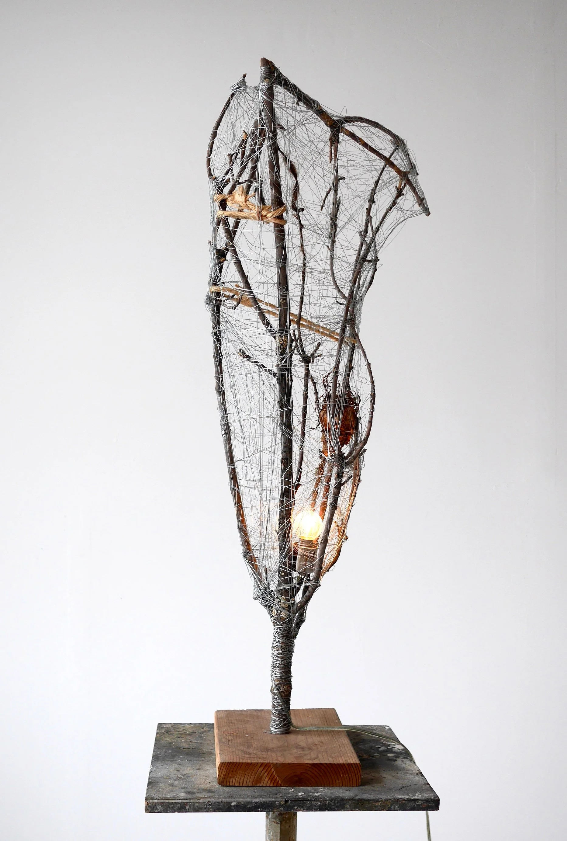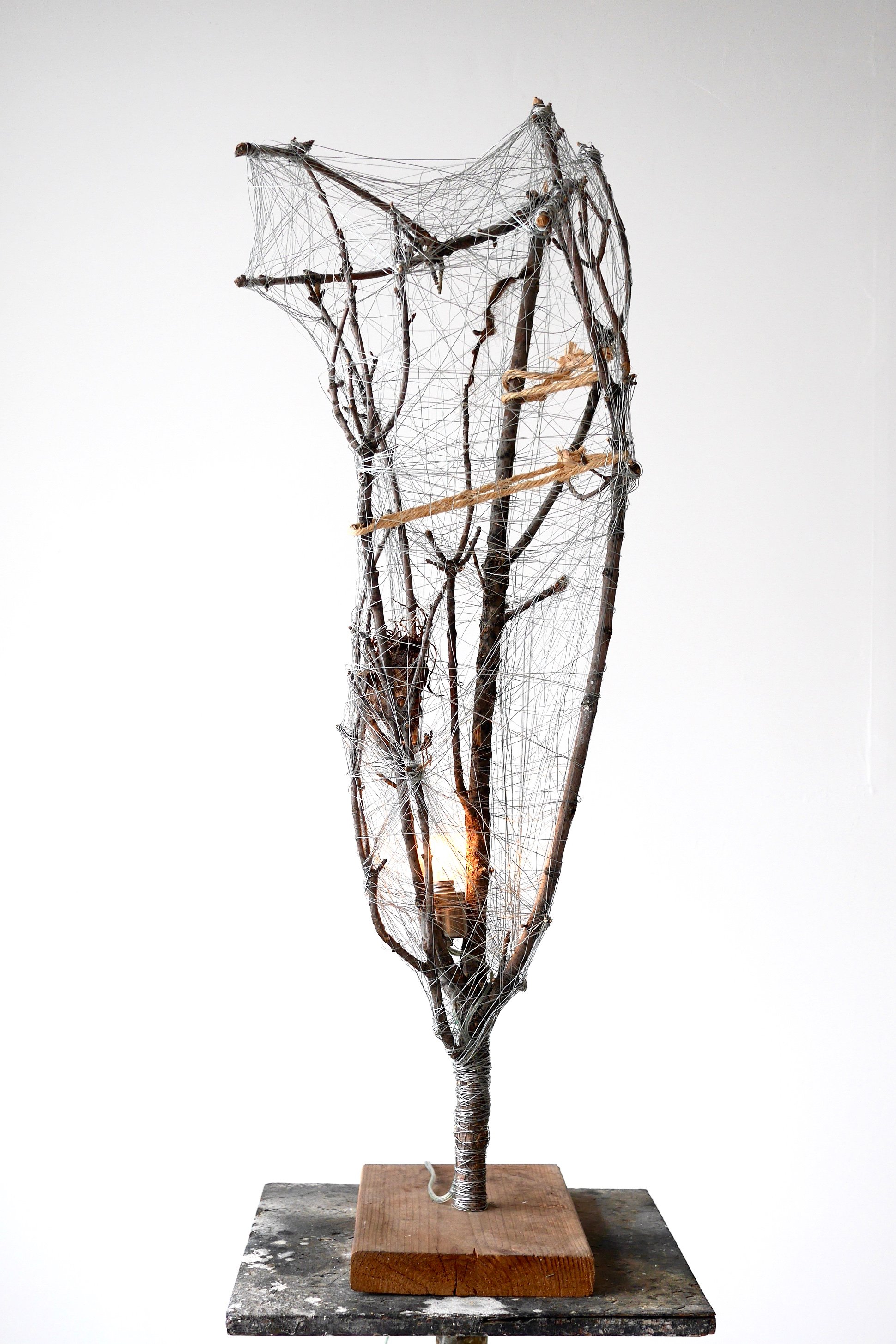 Tree branch, rope, root, light bulb, steel wire, copper wire