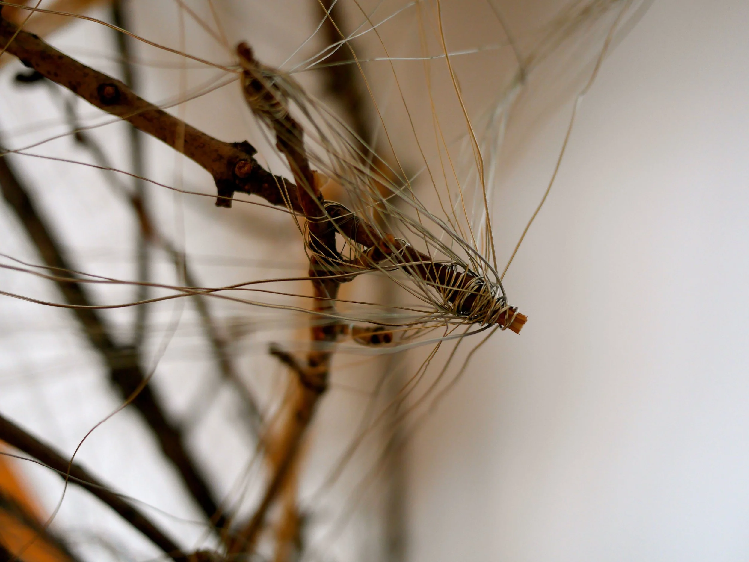 Wedding slip, cinnamon branches, broom sticks, braids of my mother’s hair, braid of my hair, red thread, red dye, electrical wire, found metal