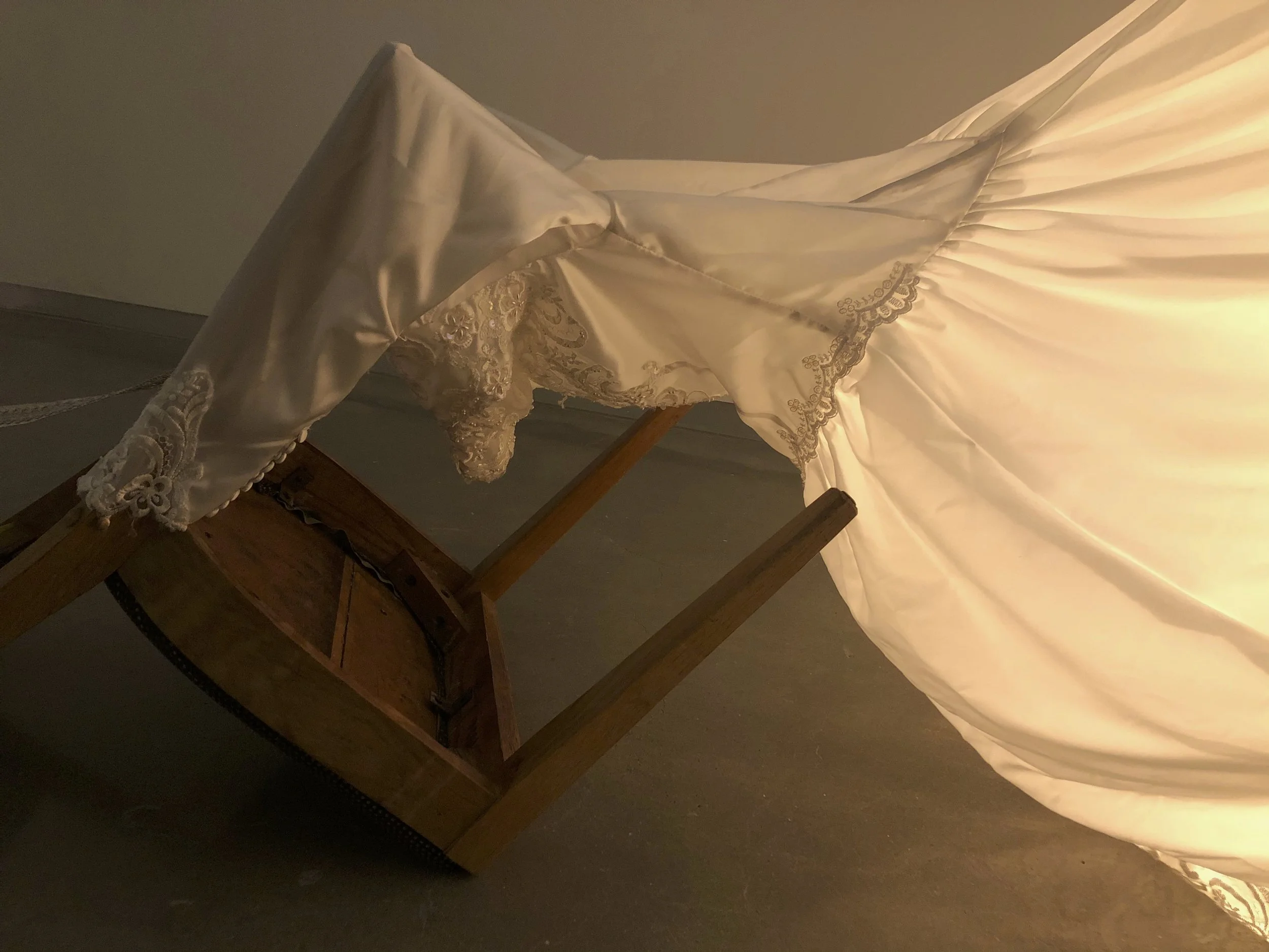 Used Wedding Dresses, Wooden Chair, 36 cans of food, Lace fabrics, internal light, Black pepper scented furniture polish