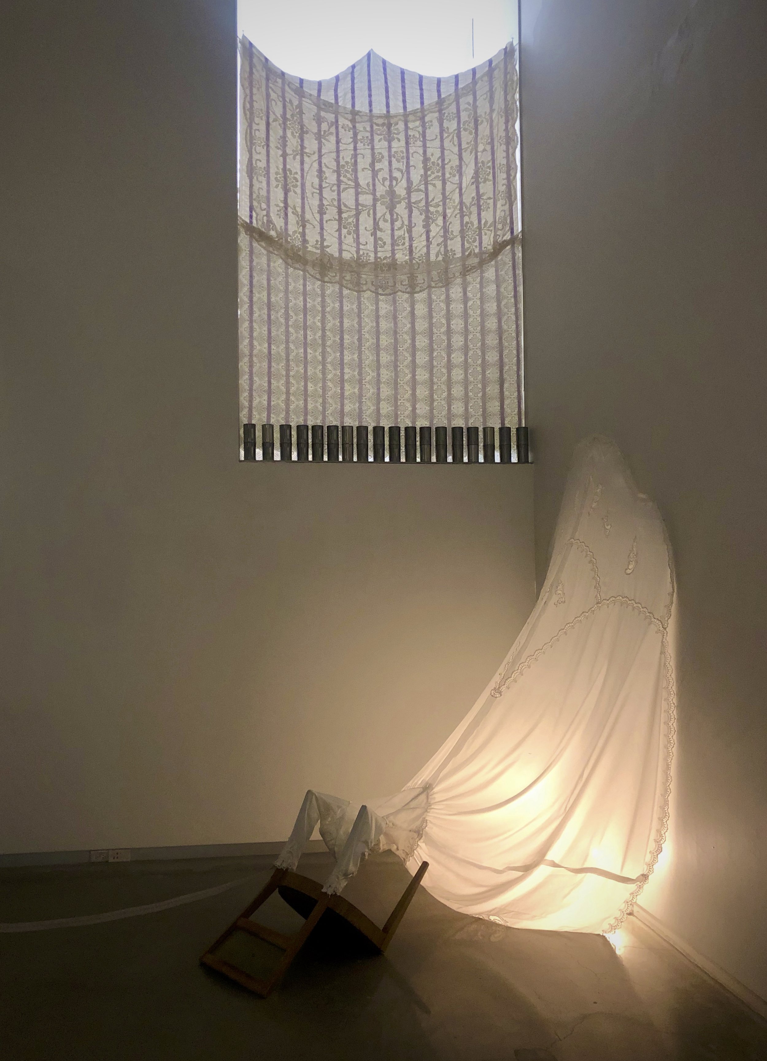 Grandmother’s bed, bed linens, lamps, lace, tablecloths, 1980’s wallpaper, internal lighting, scent of Bill Blass’ NUDE and 3rd hand smoke
