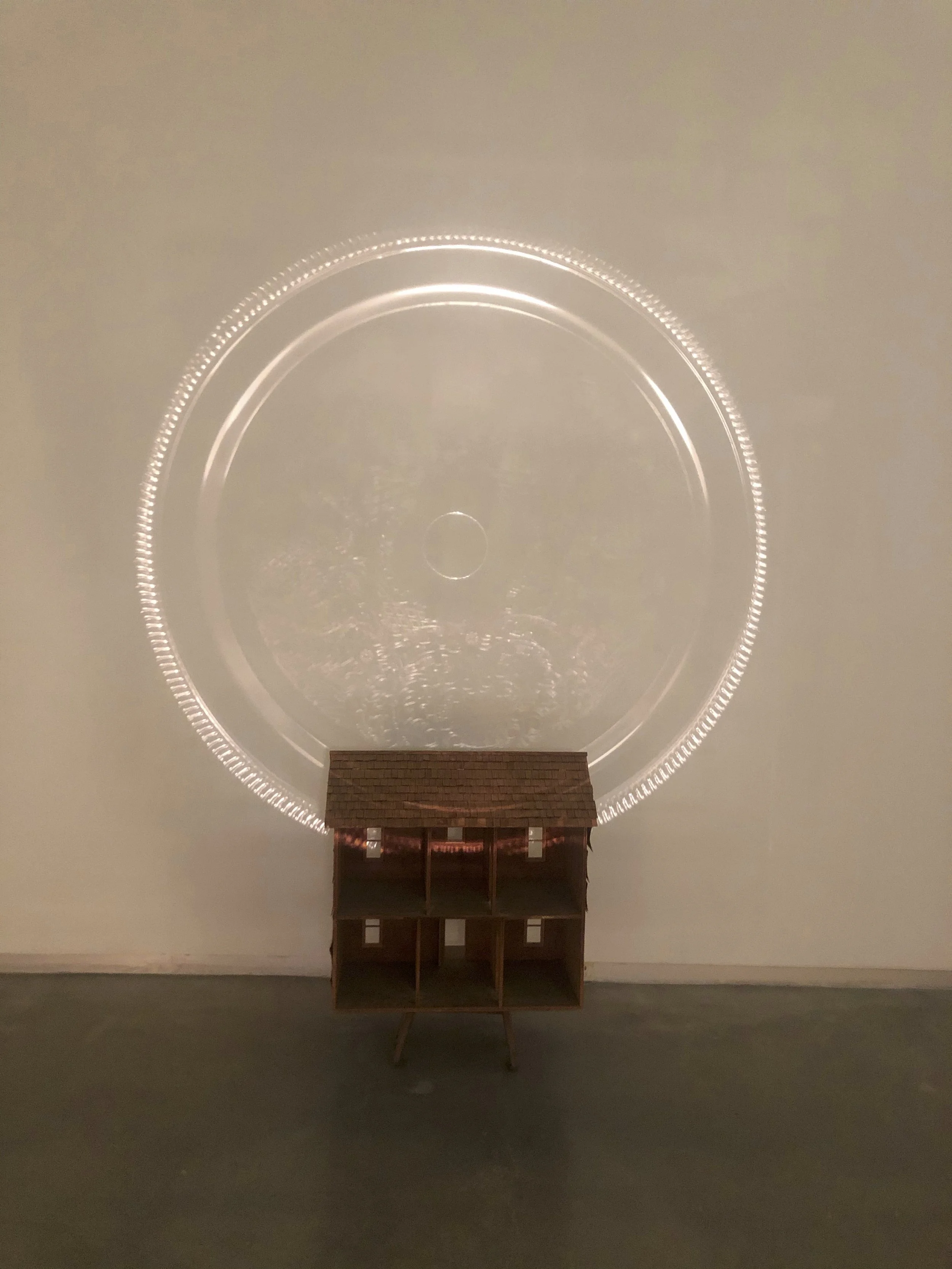 1980s child-sized victorian replica vanity, neon pink plexiglass, 30 year penny collection, discarded plastic picture frame, scrap neon orange plexiglass, with participation by rogue sapling branches