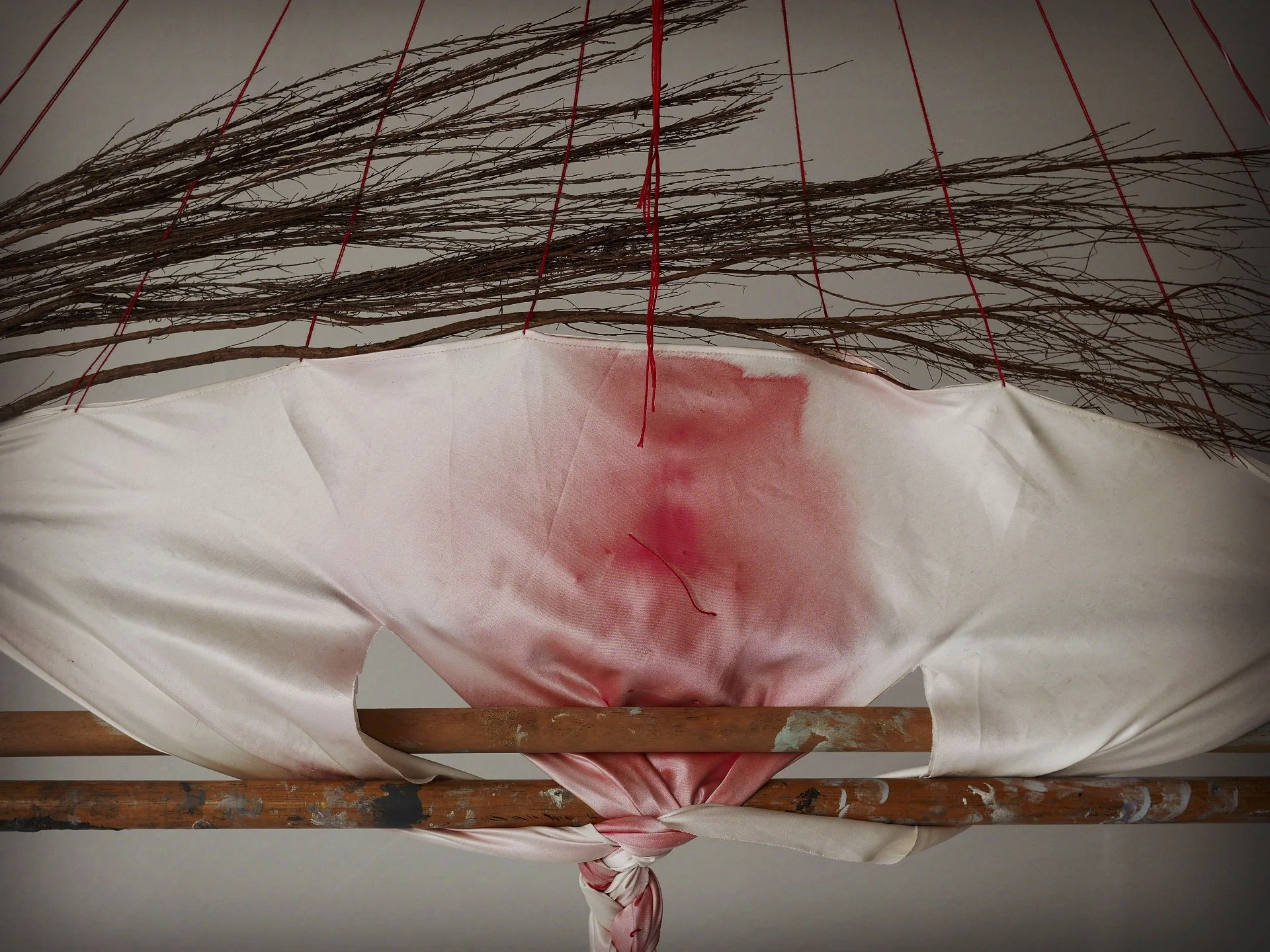 Wedding slip, cinnamon branches, broom sticks, braids of my mother’s hair, braid of my hair, red thread, red dye, electrical wire, found metal