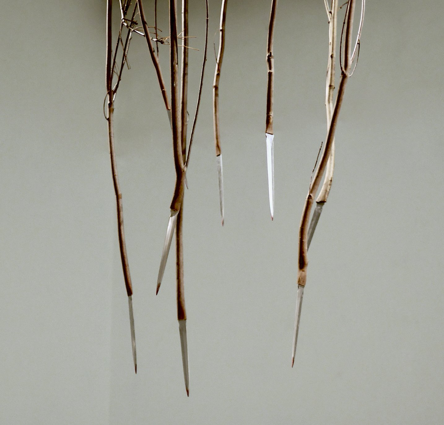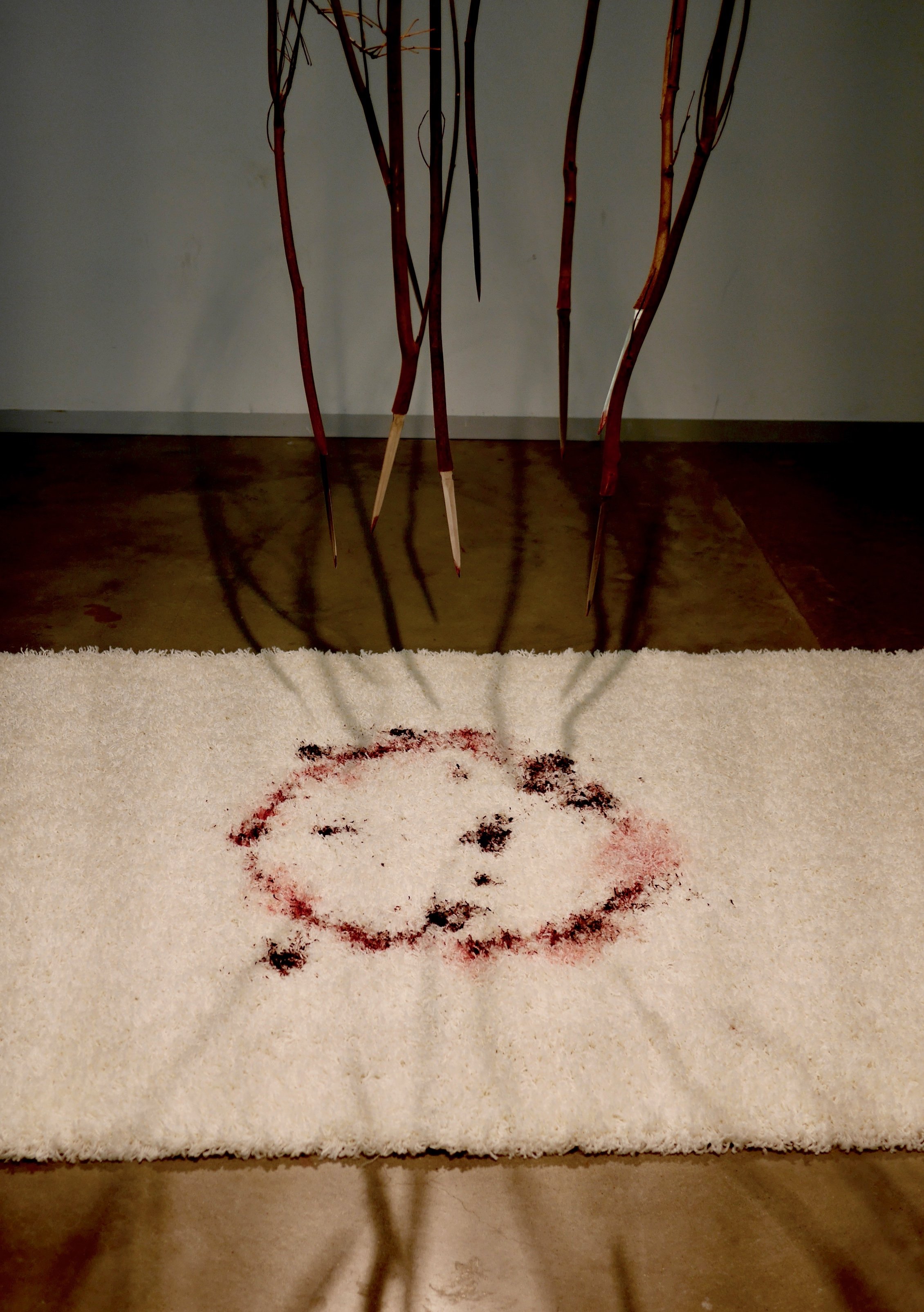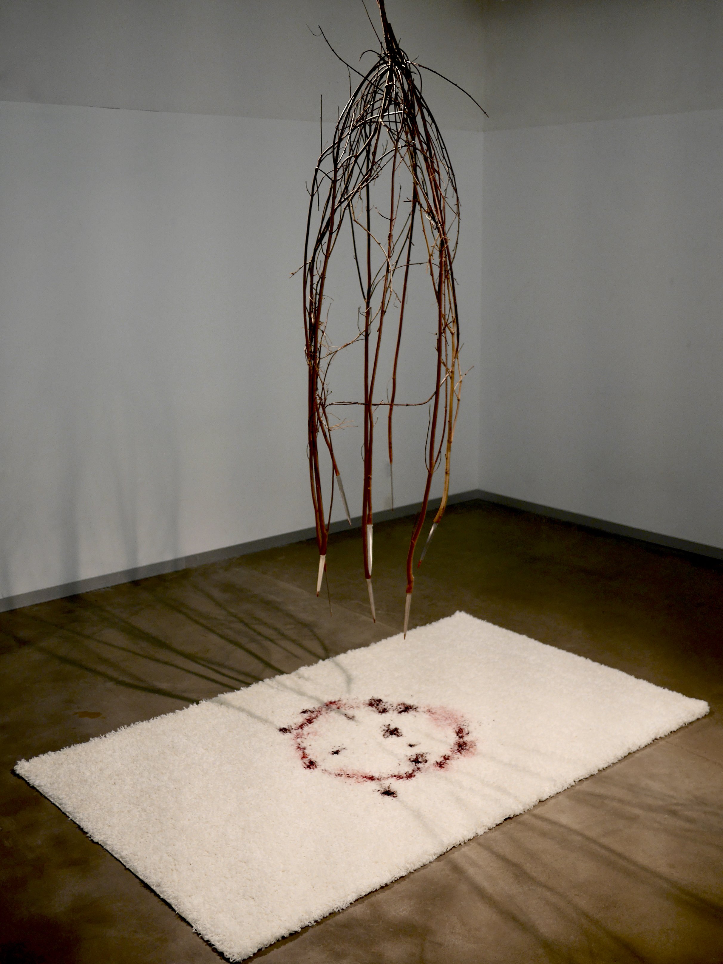 Manipulated found wood, dagger blanks, white shag carpet, dye, acrylic paint