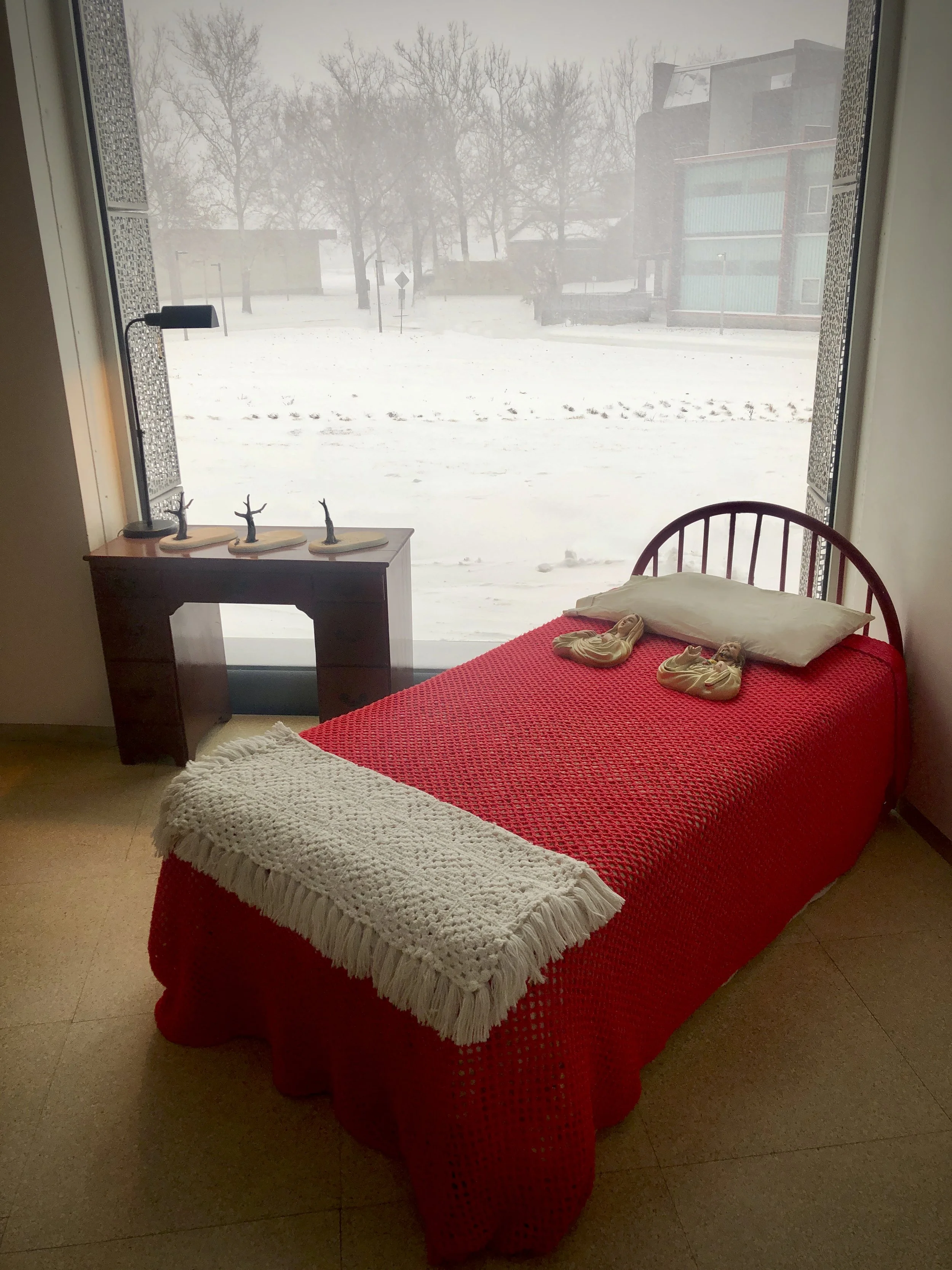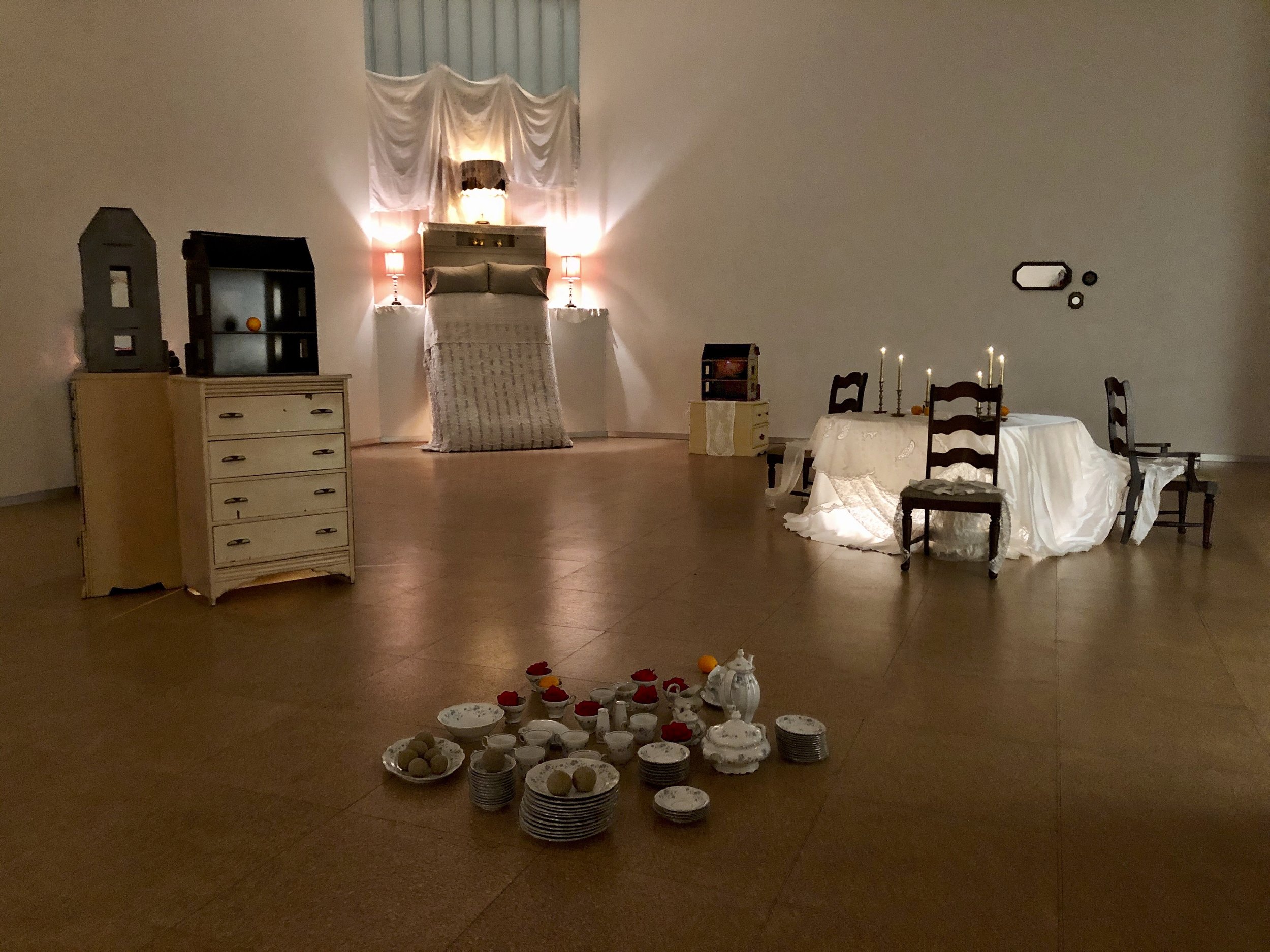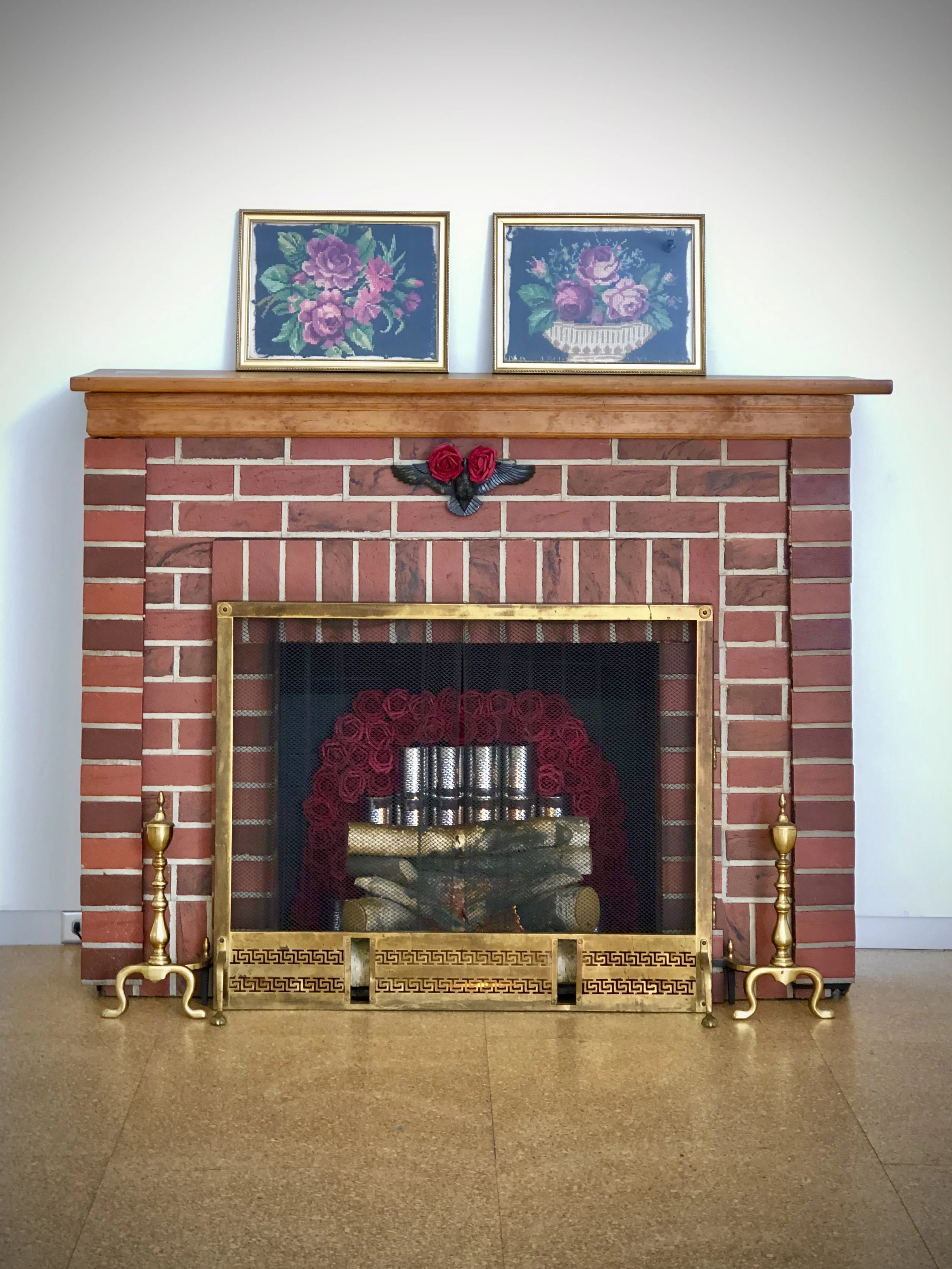 University of Iowa, 2020 mothergrandmother mothergrandmother, Site-specific Installation at university of iowa january 2020 explore mother grandmother Featured fireplace with cans and roses bed as altar formal table one dozen eggs what it was, what I saw still room, wear no forced air my dad was a child word of mouth folktale