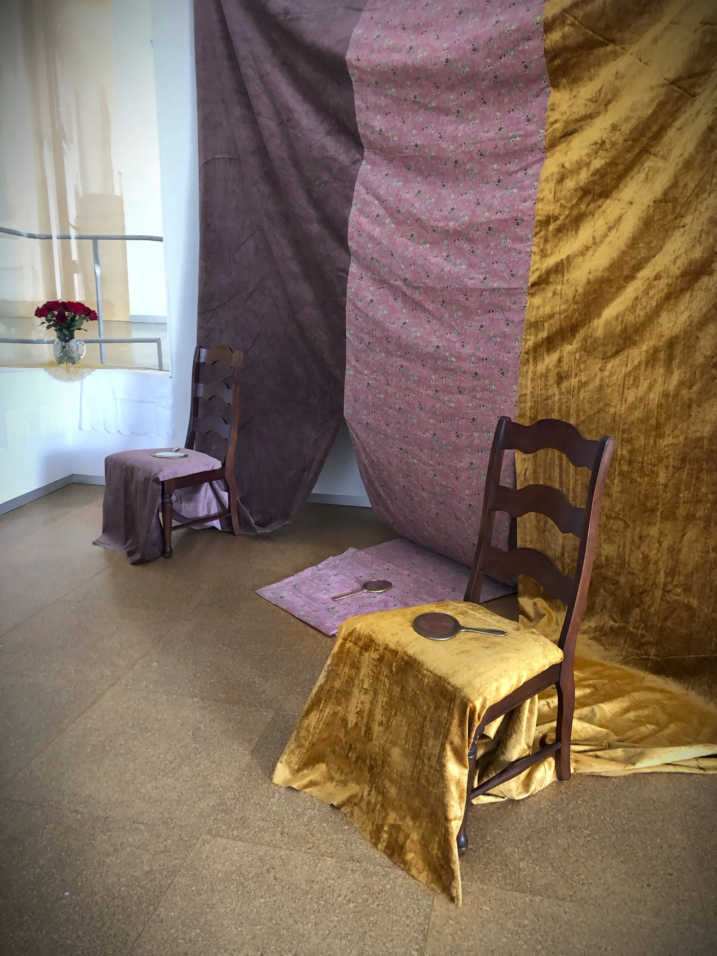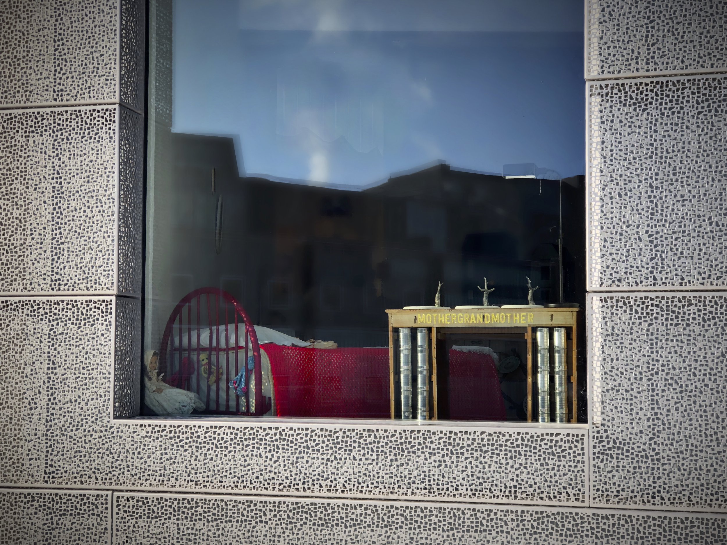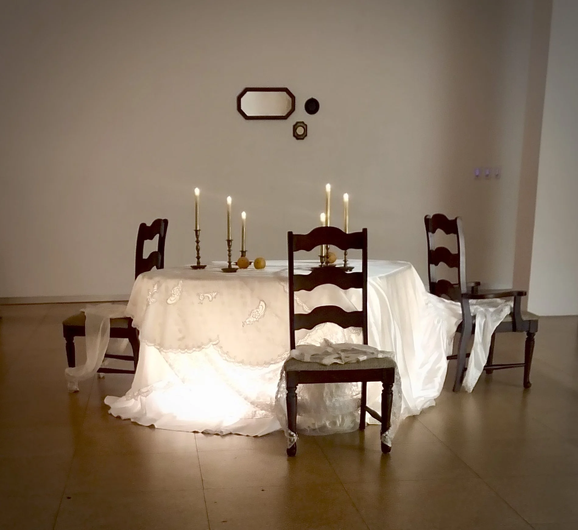 University of Iowa, 2020 mothergrandmother mothergrandmother, Site-specific Installation at university of iowa january 2020 explore mother grandmother Featured fireplace with cans and roses bed as altar formal table one dozen eggs what it was, what I saw still room, wear no forced air my dad was a child word of mouth folktale